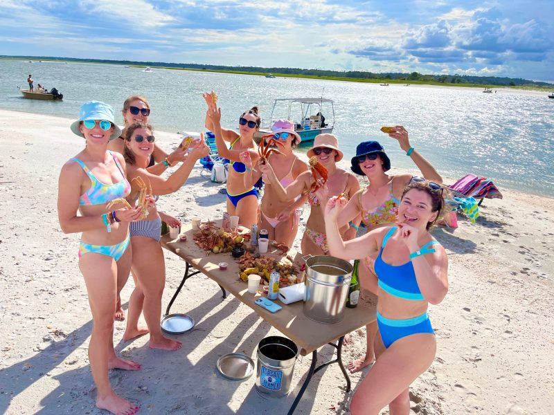 A boat cruise from Wrightsville Beach to one of the barrier islands where you will find a table set up with seating for your “catered” seafood boil dinner!